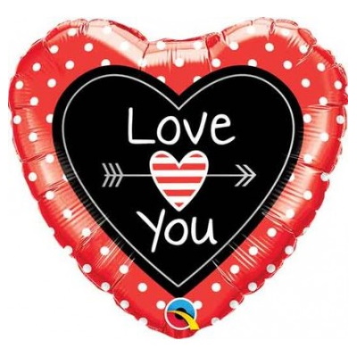 PALLONCINO MYLAR CUORE 18" ROSSO CON POIS BIANCHI E SCRITTA LOVE YOU CON FRECCIA