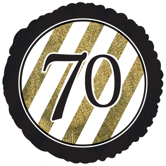 PALLONCINO MYLAR TONDO 18" CON BORDO NERO E SCRITTA 70 CON STRISCE ORO E BIANCHE