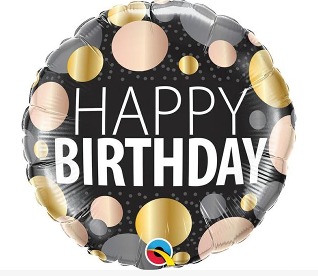PALLONCINO MYLAR TONDO 18" HAPPY BIRTHDAY NERO CON BOLLI ORO-ROSEGOLD-GRIGI