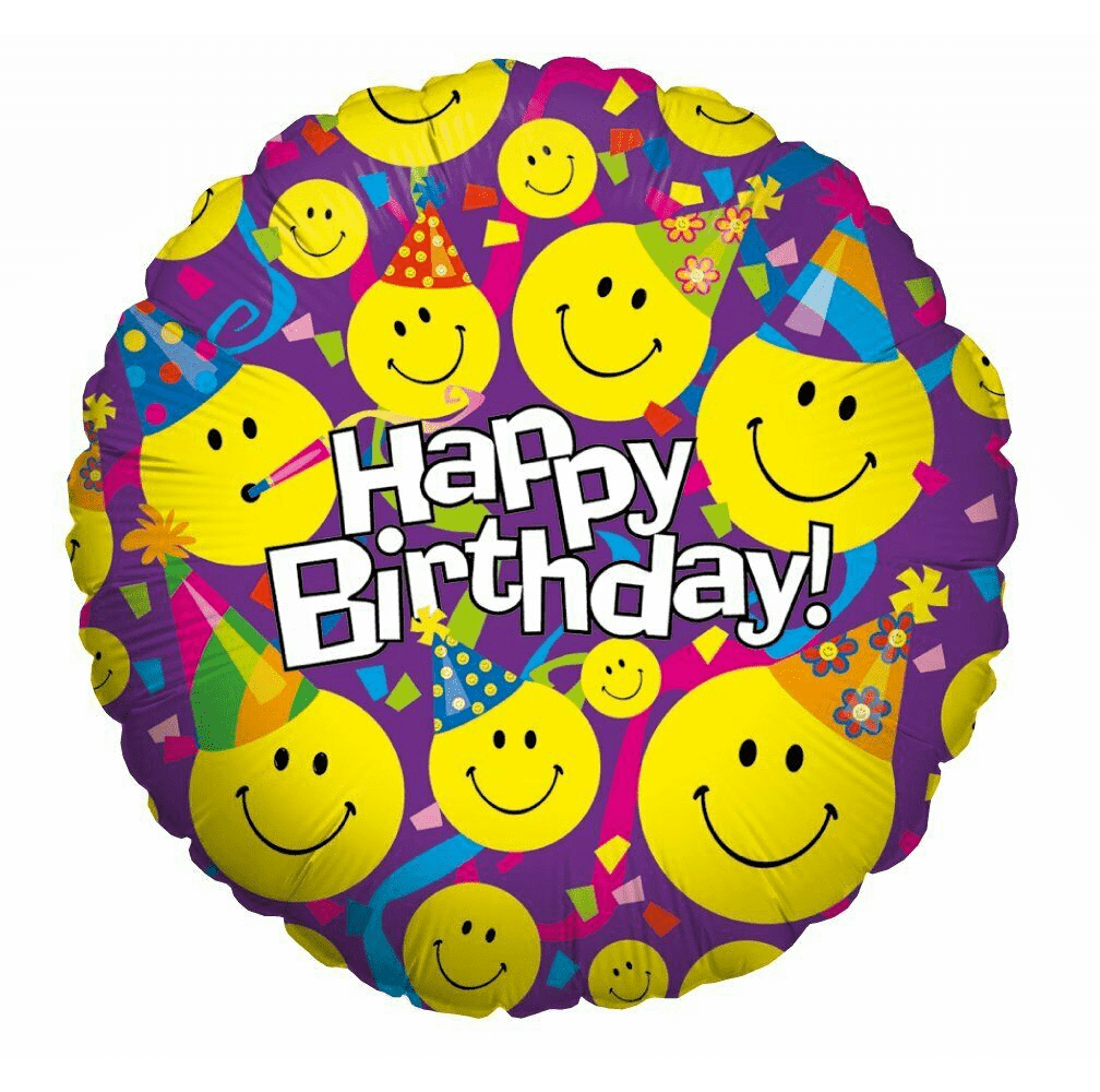 PALLONCINO MYLAR TONDO 18" HAPPY BIRTHDAY CON EMOTICON SMILE