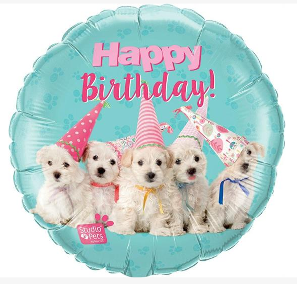 PALLONCINO MYLAR TONDO 18" HAPPY BIRTHDAY TRE CANI CON CAPPELLO