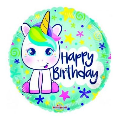 PALLONCINO MYLAR TONDO 18" HAPPY BIRTHDAY UNICORNO SEDUTO