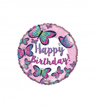PALLONCINO MYLAR TONDO 18" HAPPY BIRTHDAY FARFALLE BORDO ROSA