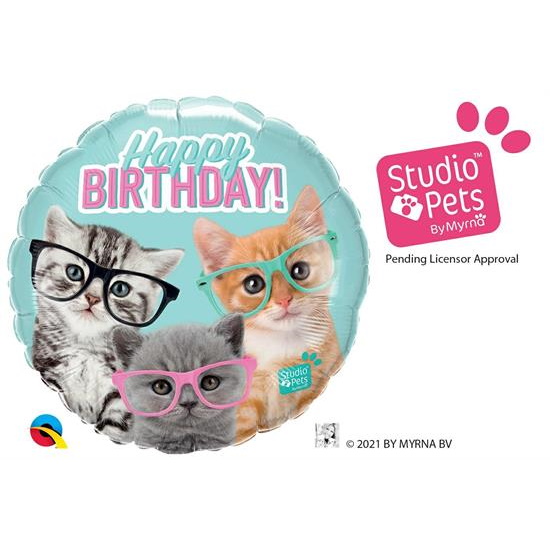 PALLONCINO MYLAR TONDO 18" HAPPY BIRTHDAY GATTINI CON OCCHIALI