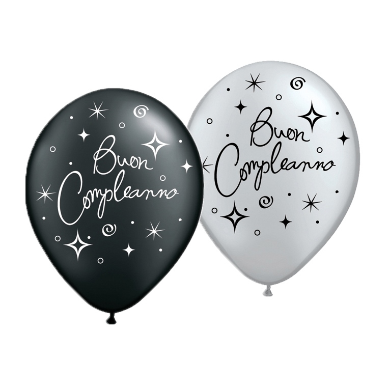 PALLONCINI LATTICE 11" STAMPATI QUALATEX BUON COMPLEANNO NERO E ARGENTO FILIGREE 100 PZ